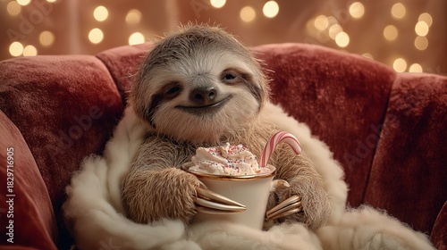 © Natalia S., Obraz premium Holiday sloth with cocoa for festive advertising, retail branding, seasonal product promotion, and Christmas marketing visuals. Warm cozy setup enhances commercial holiday storytelling, banners