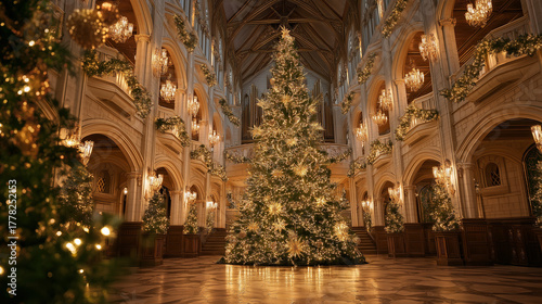 © Wasin Arsasoi, Fototapeta premium Holiday Splendor: Christmas trees illuminate a majestic church interior, evoking the warmth and grandeur of the festive season.
