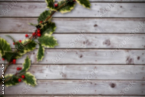 Fototapeta premium Holiday-themed flat design is showing yellow-edged holly branch with red berries on wood backdrop