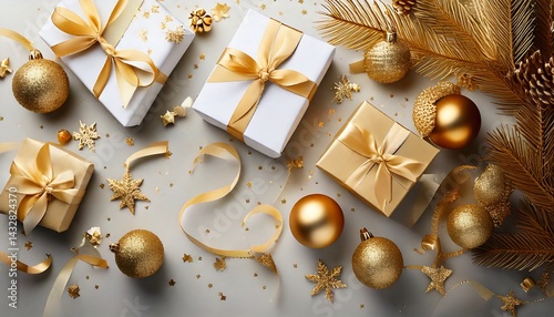 Fototapeta premium holiday-themed flat lay with gold ornaments, ribbon, and minimal luxury