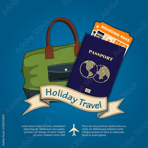 © zfmbek, Naklejka premium Holiday Travel banner or poster with travel bag and International passport with boarding passes tickets for traveling by plane. Concept for travel and vacations. Vector illustration