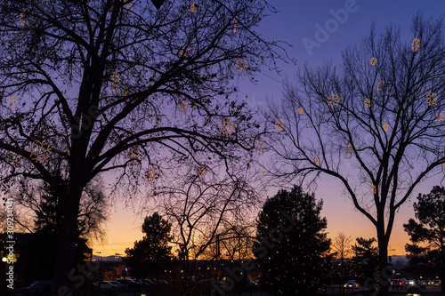 © patrish jackson, Fototapeta premium Holiday tree lights in downtown Parker, Colorado at sunset on a clear evening