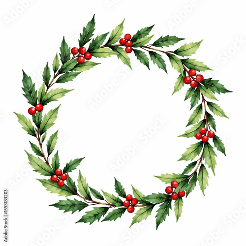Fototapeta premium Holiday wreath with green leaves and red berries in circular shape