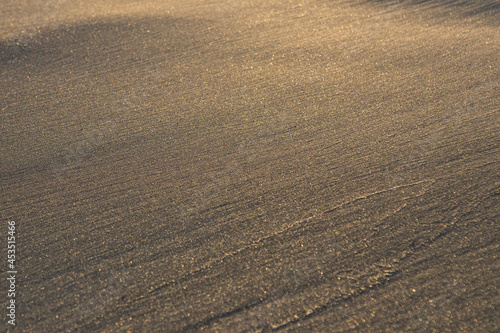 Naklejka premium Holidays by the sea, sand on the beach and gentle waves. the setting sun is reflected in the golden sand of the beach