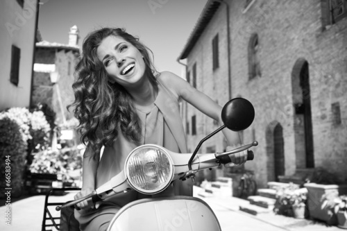 © ZoomTeam, Fototapeta premium Holidays in Italy. Girl on scooter