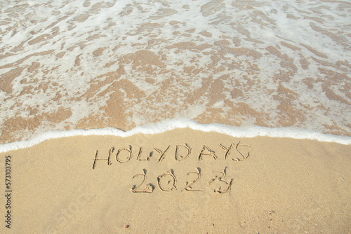 Fototapeta premium Holidays 2023 lettering on the beach with wave and clear blue sea.