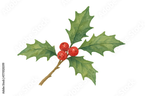 © Krtola , Fototapeta premium Holly branch watercolor painting with green leaves and red berries, conveying christmas, winter holidays, and festive decoration