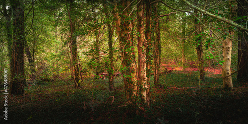 © Naya Na, Fototapeta premium Holly tree forest and tree trunks wrapped in English Vines