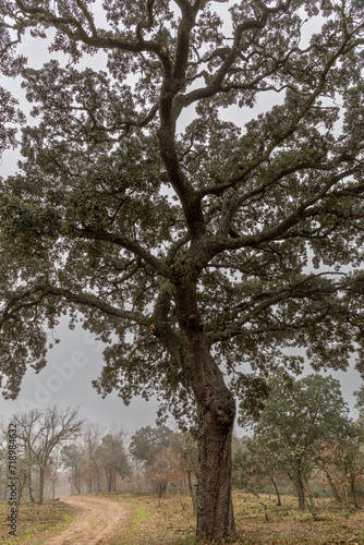 © LFRabanedo, Obraz premium Holm oak with elevated trunk and path in the forest in winter. Holm oak. Quercus ilex.