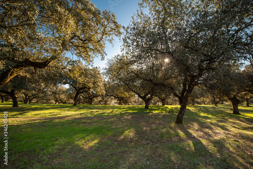 Fototapeta premium Holm oaks at sunset in a meadow