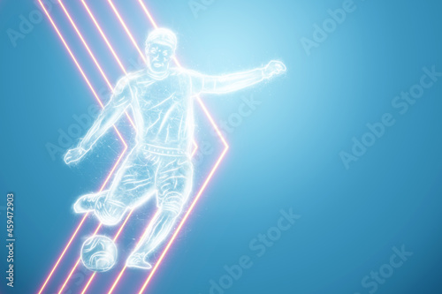 Fototapeta premium Hologram football player on a blue background. The concept of sports betting, football, gambling, online broadcast of football. 3D illustration, 3D render.