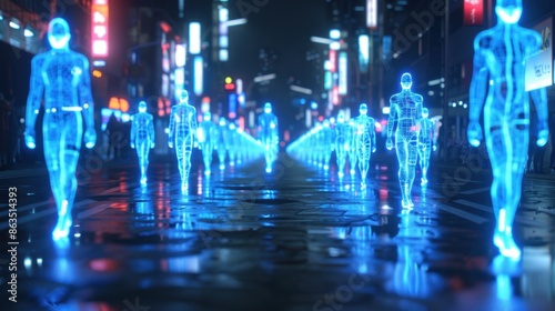 Fototapeta premium Holographic blue figures in a digital city, showcasing a futuristic vision of urban life against a dark background.