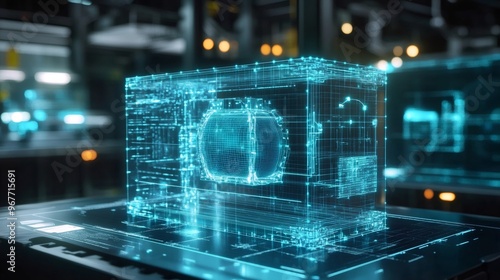 © Wish Craft Arts, Obraz premium Holographic 3D model of a device with digital blue lines on a dark background.
