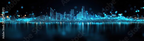 Obraz premium Holographic digital cityscape with glowing buildings and reflections