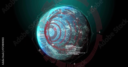 Fototapeta premium Holographic Earth globe rotating in digital display, showing mesh, red rings, data lines