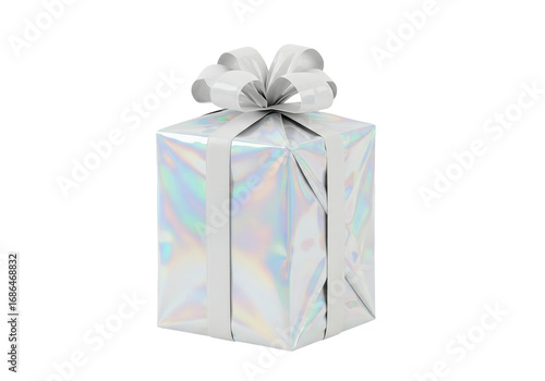 © Mayasari, Obraz premium Holographic gift box with white ribbon iridescent wrapping transparent background