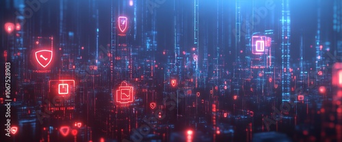 Fototapeta premium Holographic Icons Representing Digital Security Above Abstract Cityscape. AI...