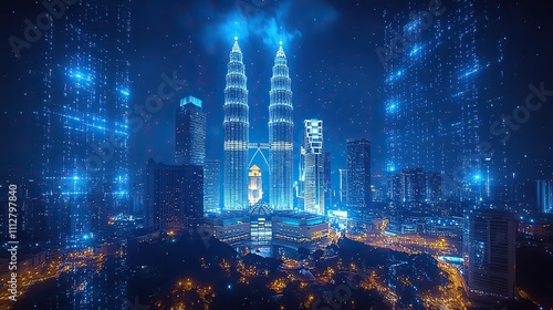 © Thoa, Obraz premium holographic information flow with a nighttime panorama of kuala lumpur s cityscape the biggest technology hub in malaysia asia is kl the notion of scientific programming double exposur
