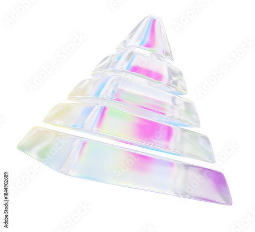 © marozhkastudio, Naklejka premium Holographic iridescent glass pyramid in pearl color. Financial or investment 3d icon, business concept. Crystal geometric triangle shape of five blocks with rainbow gradient effect