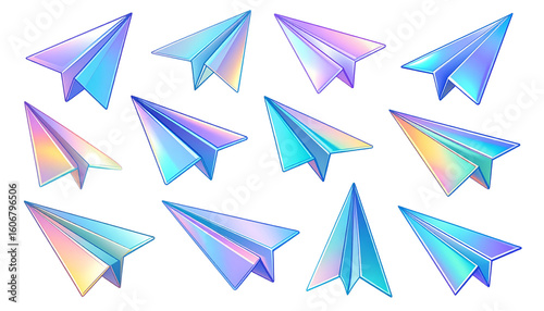 Fototapeta premium Holographic Paper Airplanes Set. Futuristic Design And Creativity Collection isolated on solid white background Png form