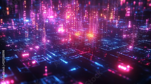 Obraz premium Holographic projection of blockchain nodes, complex network with vibrant colors and high-tech look
