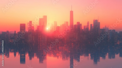 © MagicAI, Fototapeta premium Holographic skyline at golden hour, 3D illustration, sunset urban tranquility