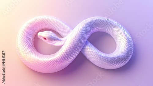 Fototapeta premium Holographic snake coils into an infinity symbol, shimmering against a gradient backdrop in pink, purple, and white. Its intricate patterns offer a fresh perspective on infinity