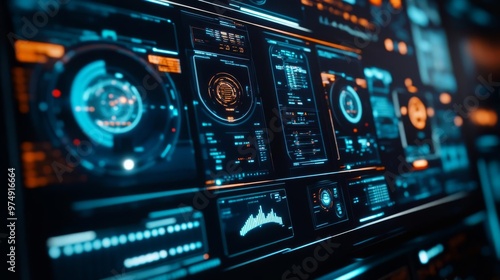 Obraz premium Holographic space station control, digital interface, floating data panels