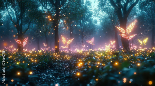 Naklejka premium Holographic trees are vividly growing in a virtual forest