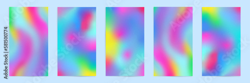 Obraz premium Holographic vertical backgrounds, templates for social media posts and stories banners. Blurry abstract designs. Wavy rainbow gradient layout template set. Vector illustrations with gradient mesh.