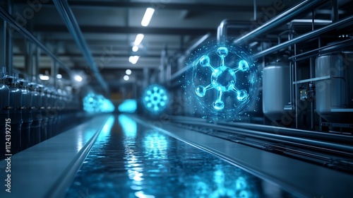 Fototapeta premium Holographic Water Molecule Symbols Glowing in a Futuristic Purification Facility