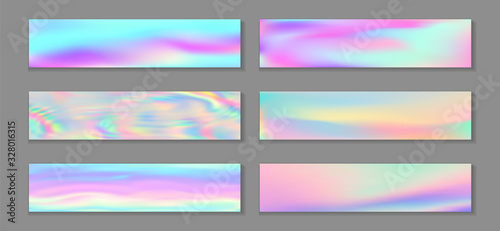 Fototapeta premium Holography creative banner horizontal fluid gradient mermaid backgrounds vector set. Girlish