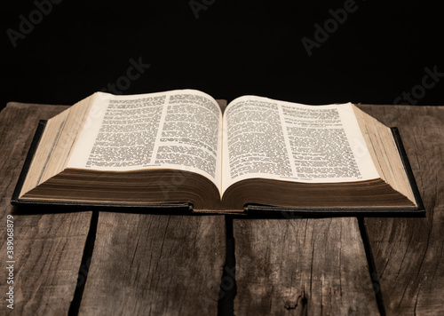 Fototapeta premium Holy bible open on rustic wooden table in dark night.