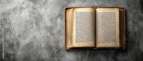 © Nattapat, Obraz premium Holy book open on a grey background, featuring a copy space banner for adding religious or inspirational text