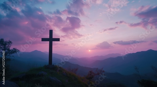 © Arthur, Obraz premium Holy concept: A silhouette of the cross on top of the hill with an on-mountain sunset beautiful sky background, the concept for Easter and Jesus Christ.