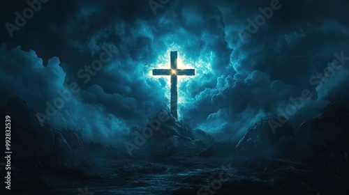Naklejka premium Holy cross symbolizing the themes of death and resurrection with a lighted sky