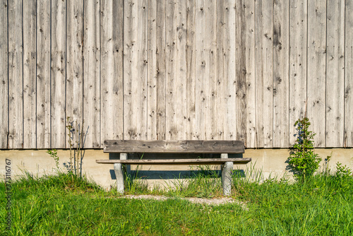 Naklejka premium Holzbank zum Ausruhen vor einer Holzwand