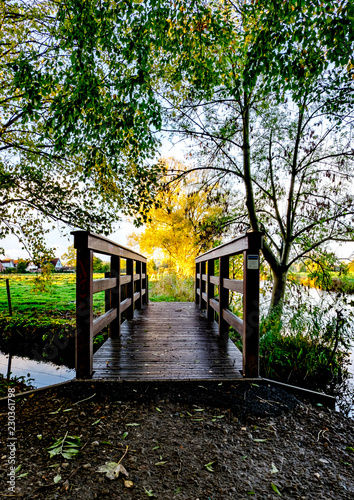 © rainer K, Obraz premium Holzbrücke am Fluss mit Bäumen in herbstlichen Farben