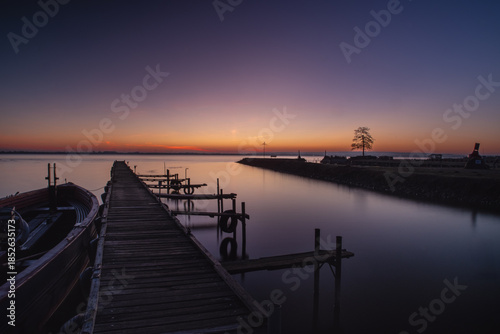© tanja_riedel, Fototapeta premium Holzsteg am ruhigen See in der blauen Stunde, Ein langer Holzsteg führt über einen stillen See in die Abenddämmerung. Der Himmel zeigt einen sanften Farbverlauf von warmem Orange zu tiefem Blau, währe