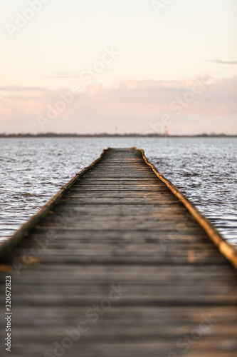 © Tom, Obraz premium Holzsteg im Meer im Sonnenuntergang