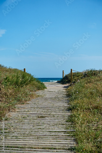 Fototapeta premium Holzweg, Düne, Meer, blauer Himmel
