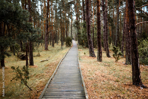 Obraz premium Holzweg durch den Wald, Wanderweg