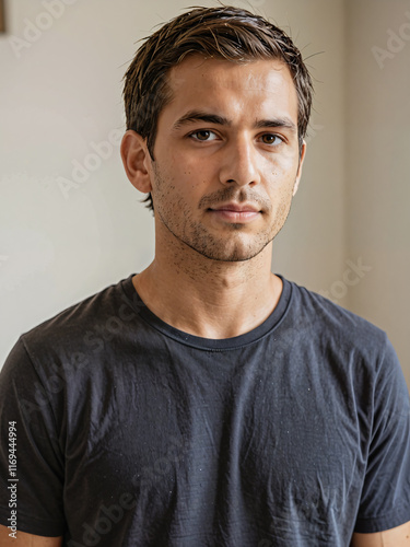 © Arepa, Fototapeta premium Hombre latino con camiseta negra en el interior de una casa