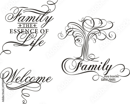 © Vallentin Vassileff, Fototapeta premium Home and Family quote decors, vector wall art series. Ornamental calligraphy inspirational sign designs, lettering phrases for posters, wall decals, love quotes, family holiday signs, greeting cards.