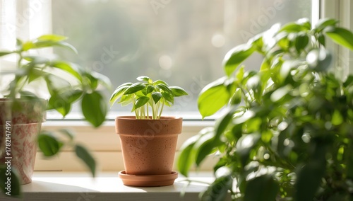 Fototapeta premium Home gardening, basil seedlings in a flower pot on a windowsill, beneficial for indoor air quality