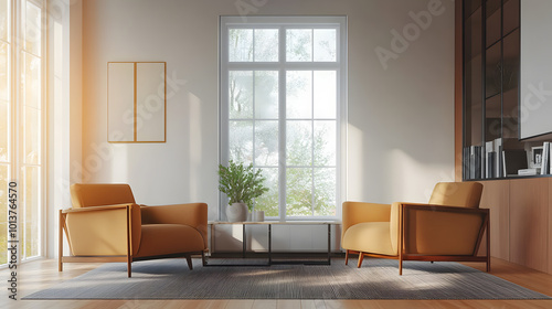 Fototapeta premium Home living room interior with armchairs and decoration, window. Mockup wall