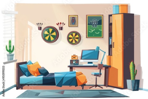 © Fotograf, Fototapeta premium Home office setup with a bed, desk, and computer, ideal for remote work or studying