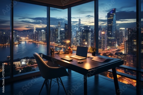 Obraz premium Home office setup with a view of the city skyline, where remote work meets...