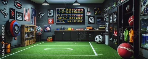 Fototapeta premium Home office with a dynamic sports theme, featuring memorabilia from various sports, a synthetic turf floor, and a scoreboard display Energetic and vibrant