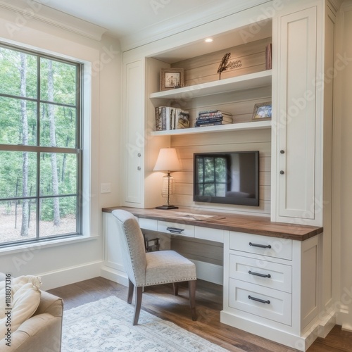 Fototapeta premium Home Office with Built-in Bookcases and Desk